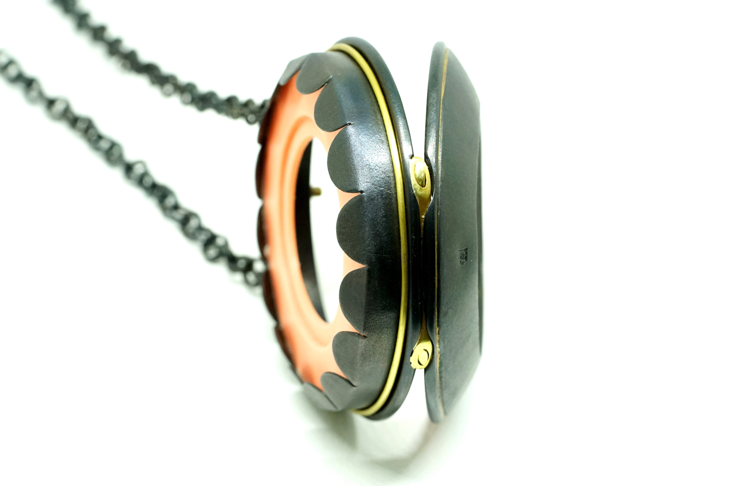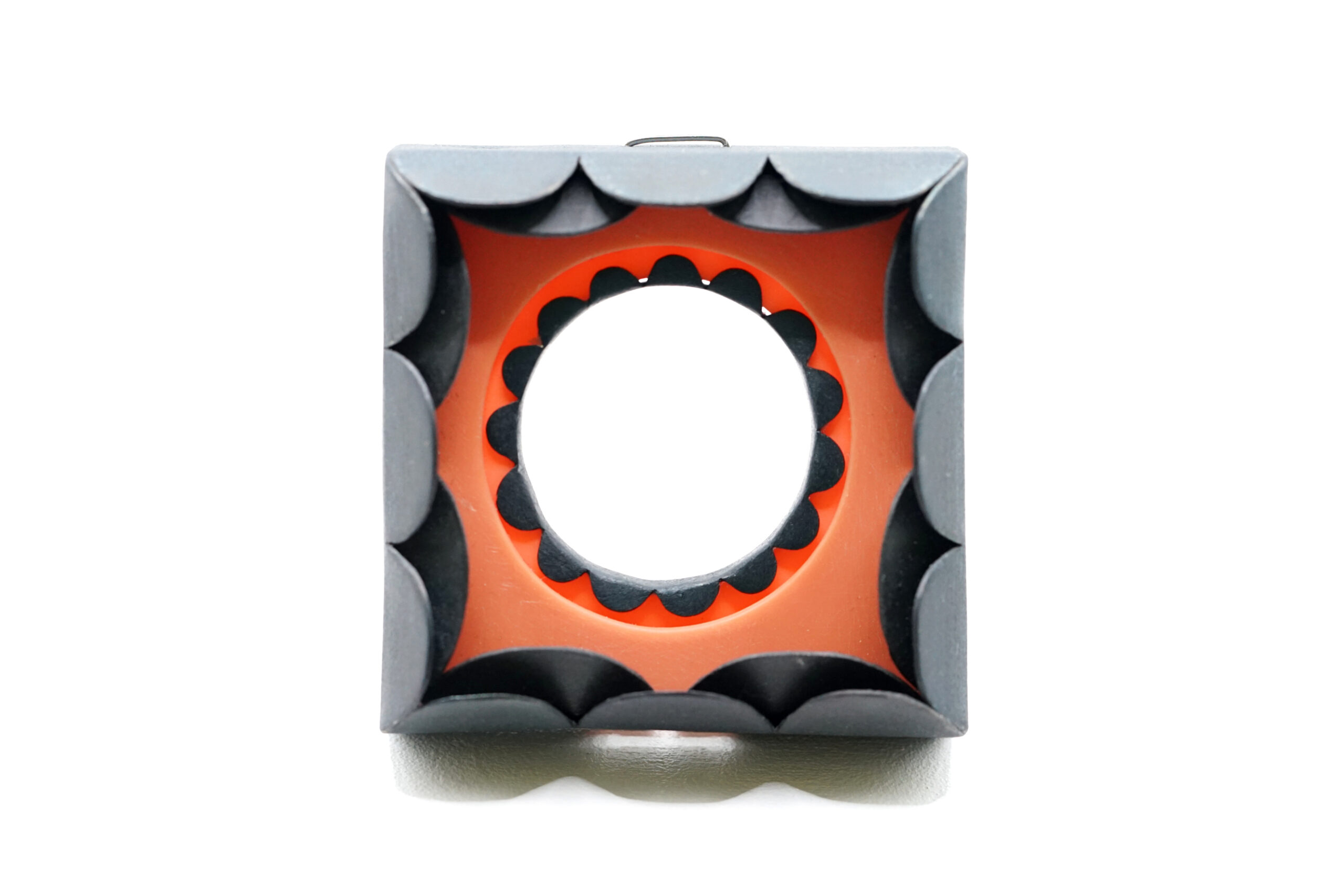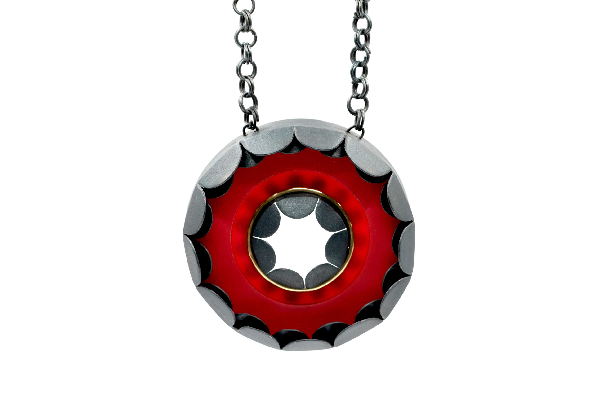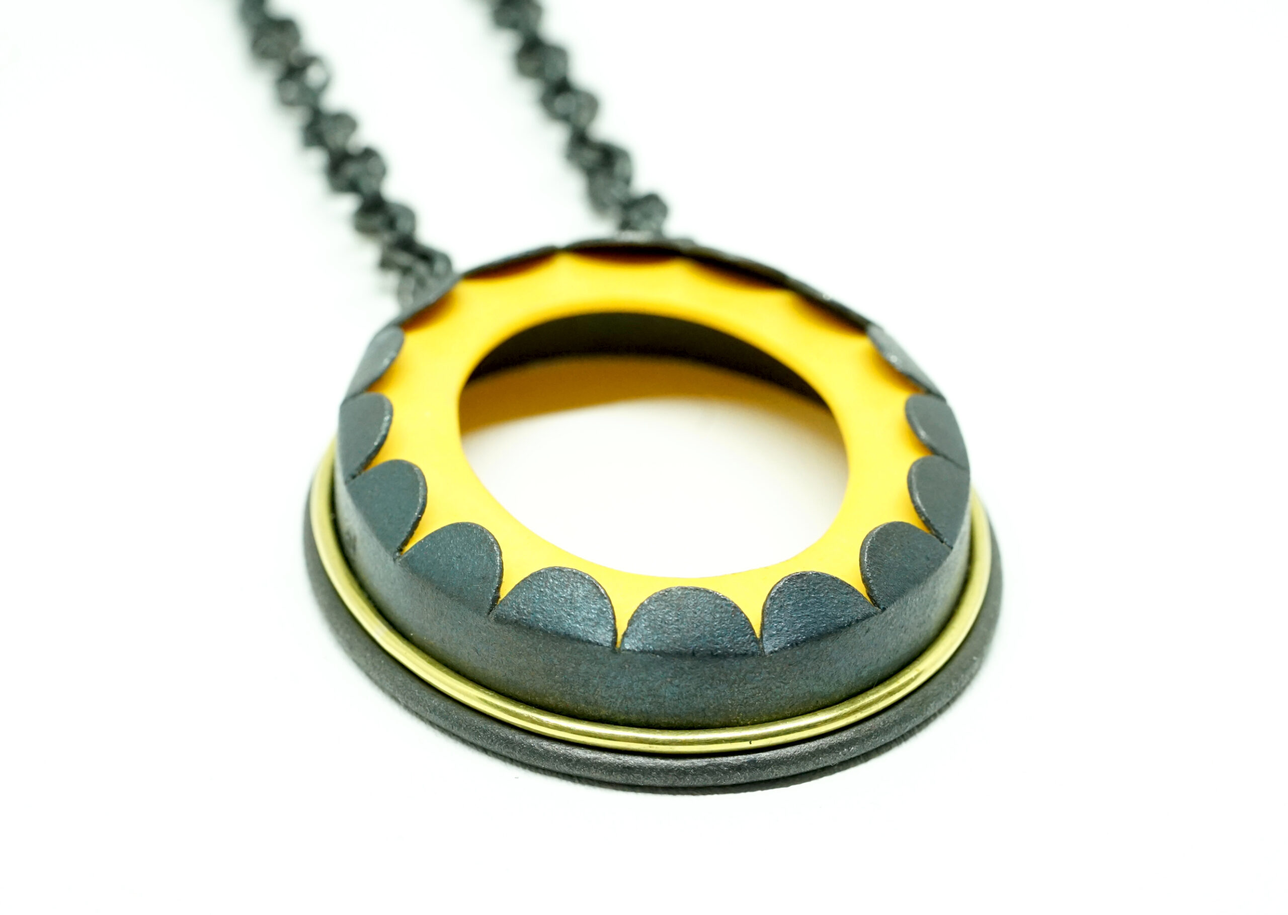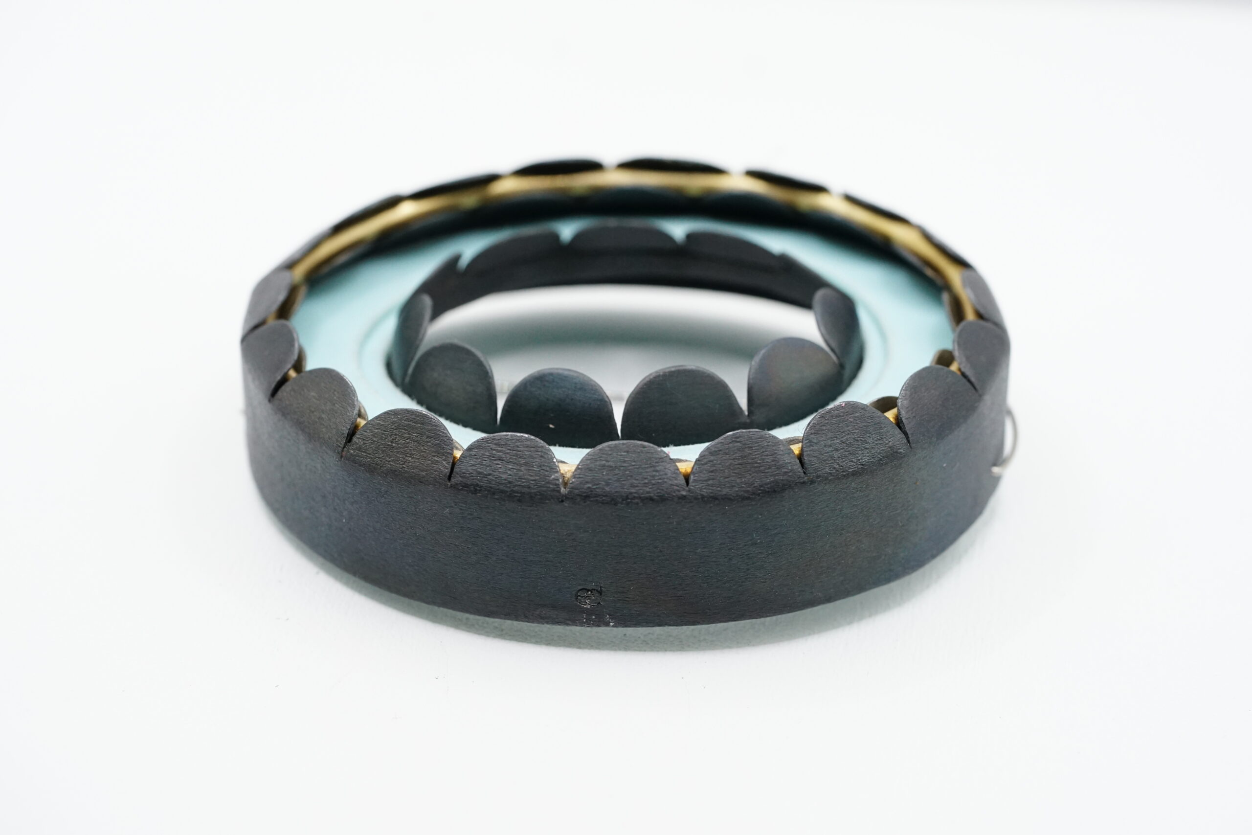 In my series "Centered", I explore the interplay between presence and absence. Crafted frames made of blackened iron hold cut-out, colored plastic plates and together form striking and dominant structures. At the center of the pieces, an empty space remains – intentionally left open, not as a deficiency, but as an essential part of the composition.